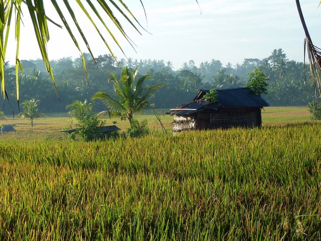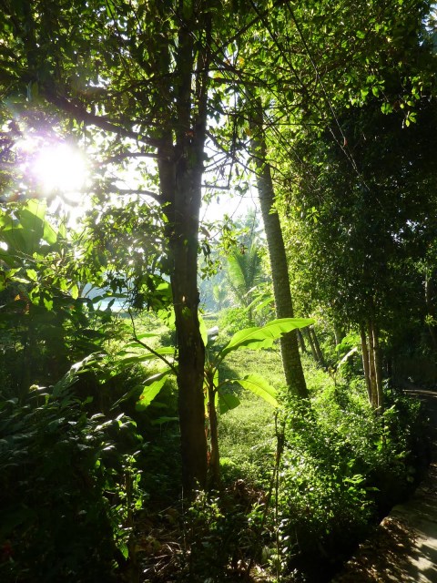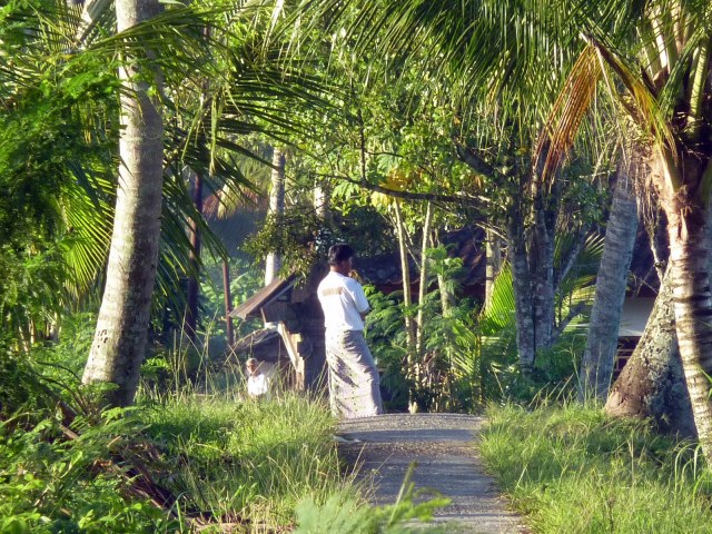 Auf dem Rückweg zum Narasoma Homestay hätte ich eigentlich gerne noch irgendwo einen richtig guten Bali-Coffee getrunken. Da es so früh war, hatte allerdings noch nichts auf. Auf dem Market (den ich dann ja später entdeckt habe) war es mir ehrlich gesagt zu rummelig und zu voll. Nach dieser schönen Zeit der Stille in den Reisfeldern hätte mich das schier überfordert, auch wenn es sich natürlich angeboten hätte, dort eine Suppe zu verspeisen oder einen Kaffee mit den Leuten zu trinken. So bin ich also „nach Hause“ geschlendert (Hannah hat noch geschlafen), habe mir einen lecker Tee gemacht (davon muss ich unbedingt noch welchen mitnehmen) und eine Mail für Thomas entworfen.