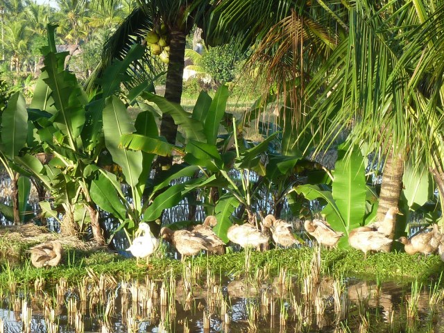 Tempel hier, Tempel da, Frau mit Blumenkorb auf dem Korb da, Mann mit Sense in der Hand da. Sehr schön! Ich bin die Straße immer weiter gegangen und nach einigen Brückenüberquerungen stand ich mitten in den Reisfeldern. Wunderschön! Reisbauern, die ihre Enten über die Reisfelder führten, Kinder, die sich auf den Weg in Schule gemacht haben, Frauen, die mit Einkäufen aus dem Dorf zurückkamen. Ich war wieder so beseelt, dass ich erst einmal 3 Tränen verdrücken musste.