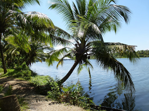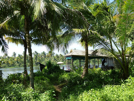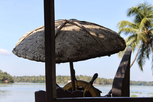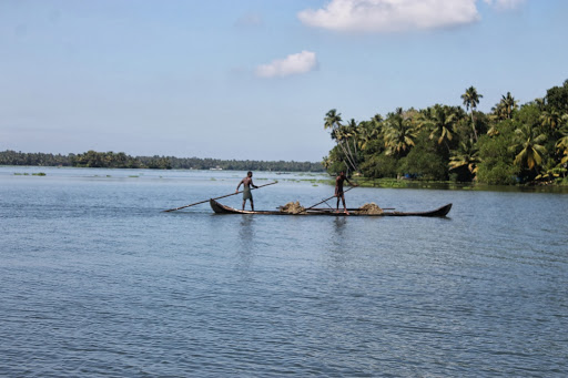 Nach einer knappen Stunde Fahrt wurden wir dann wieder rausgeschmissen und nach einem kleinen Fußweg durch ein kleines „Dorf“ (naja, eher 2 – 3 Häuser und 4 Kühe) lag unser Boot. Ich hatte ja eher mit einem kleinen überfüllten Boot gerechnet, aber denkste. Ein sehr großes Boot für uns 9 People und einen Guide. Wer wollte, hätte sich sogar zum Schlafen hinlegen können. Nach einer kurzen Einführung von Sasha (unserem Guide) tuckerten wir los. Überall Palmen, überall Leute am Ufer, überall Fischer auf den Flüssen, überall Fische, die aus dem Wasser sprangen. Wir bekamen ein wenig Geschichte von Kerala erzählt (leider sehr schwer verständlich), all die Namen, die wir uns unbedingt merken sollten, sind bei mir schon wieder verschwunden. Ein Gehirn wie ein Sieb? Oder lag es doch einfach an der schlechten Aussprache? Vollkommen schnuppe …