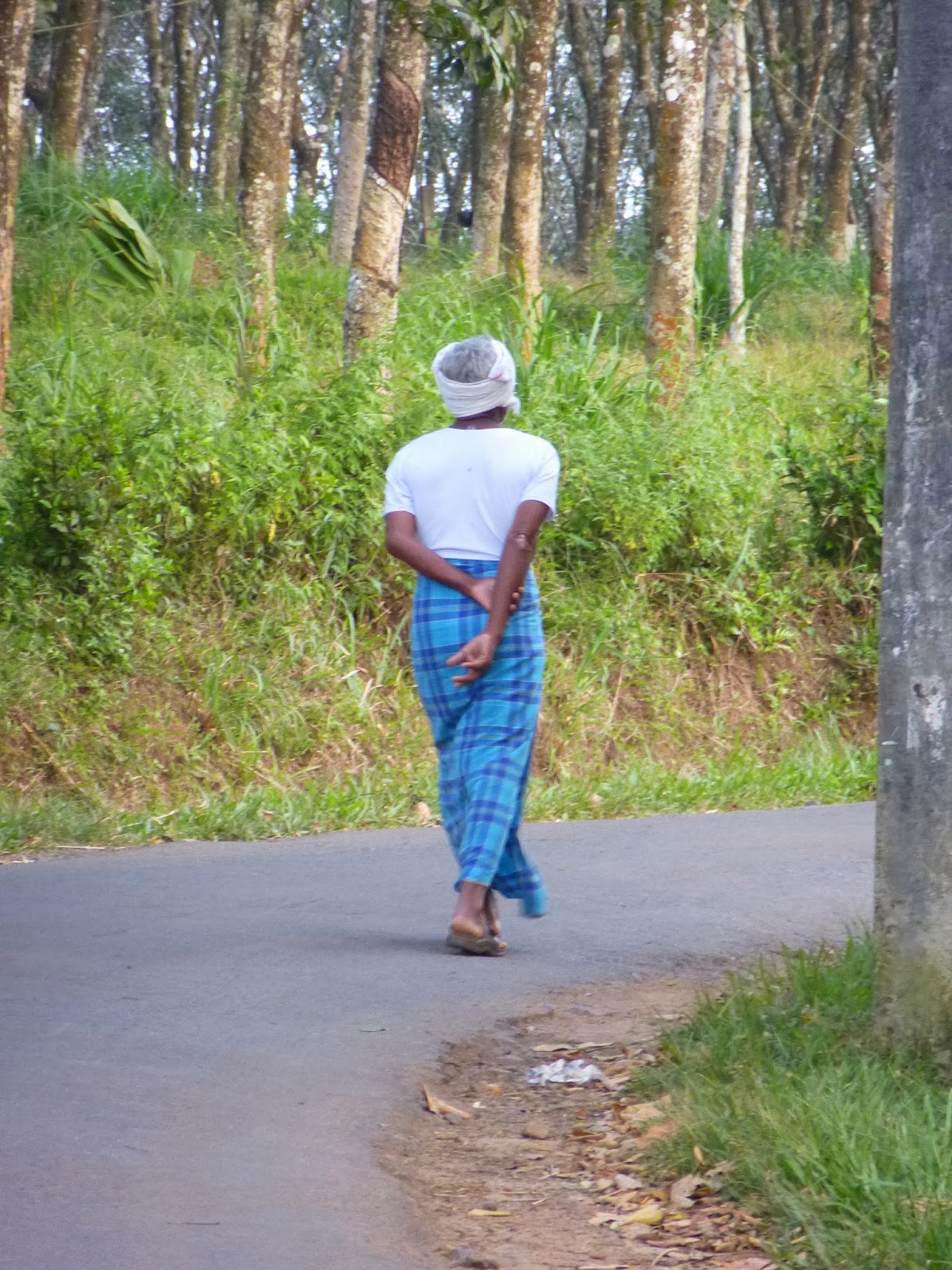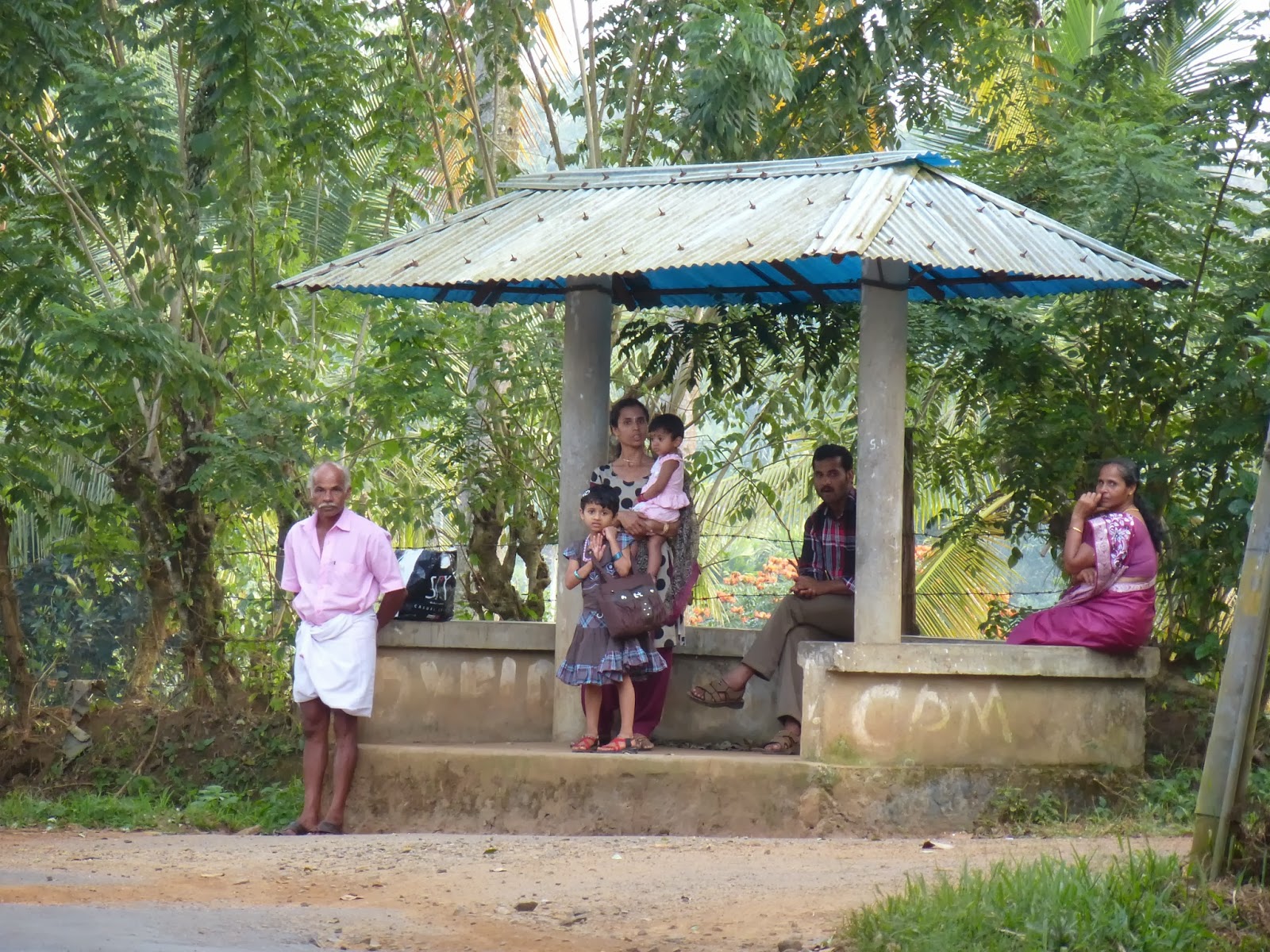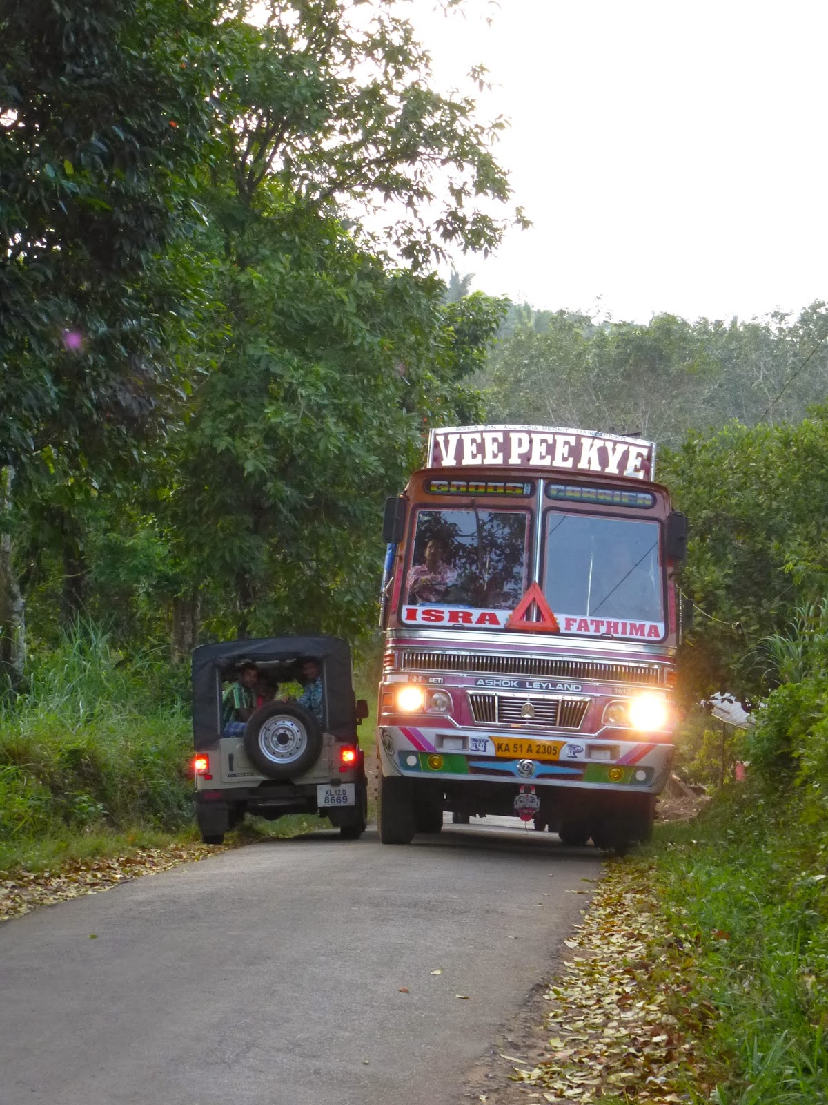 Die Fahrt hier hoch war anfangs eher langweilig – was in Indien halt langweilig ist :). Eine Stadt reihte sich an die andere, viele Leute zu sehen, aber keinerlei Landschaft. Das änderte sich schlagartig, als wir Calicut hinter uns gelassen und ab in die Berge gefahren sind. Reisfelder, Regenwald, enge Serpentinen, die sich die Berge hochwanden. Und natürlich wurde auch auf diesen Serpentinen um jeden cm. Fahrbahn und Schnelligkeit gekämpft. Nicht nur unser Fahrer tat das, die übrigen 245 Laster und 367 Busse und 137 Autos taten das auch. Gab 2 Unfälle auf der Strecke, zum Glück nicht mit uns…
