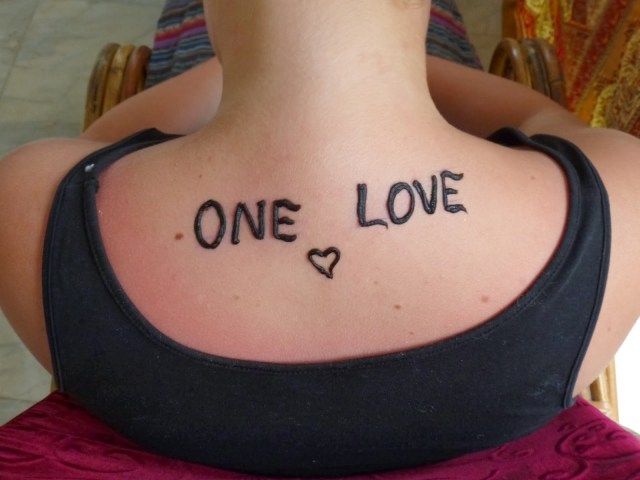 Hannah hat inzwischen ein schönes großes „One love“-Henna-Tattoo auf dem Nacken. Sah sehr geil aus! Leider pellt sie ab heute wie verrückt auf dem Rücken, so dass es jetzt gerade nicht mehr ganz so schön aussieht.