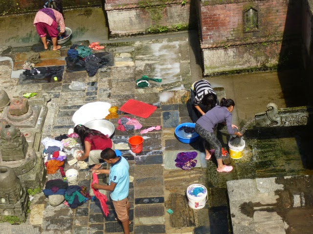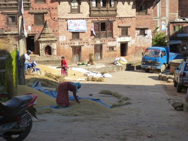 Überall Gläubige, die die Tempel besuchten und ihre Pujas verrichteten. Auf der Straße hockende Bauern, die Gemüse aus Körben anbieten und Frauen, die ihre Wäsche an öffentlichen Plätzen waschen. Dazu noch ein paar Leute, die Reis dreschen (heißt das so??) und jede Menge selbsternannter „Führer“, die einem die Stadt zeigen und erklären wollen.