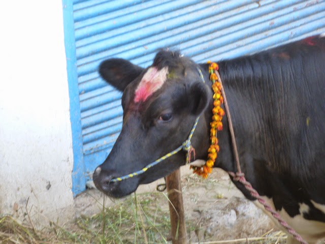 Am dritten Tag drehte ich alles um die Kühe! Sie erhielten ebenfalls Tikas und bekamen Blumengirlanden umgehängt.