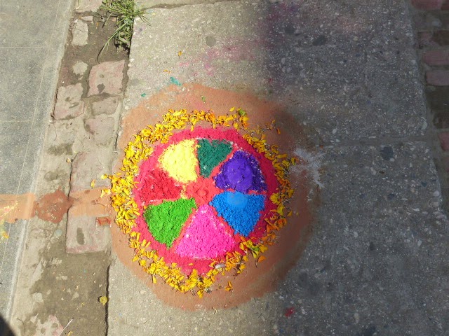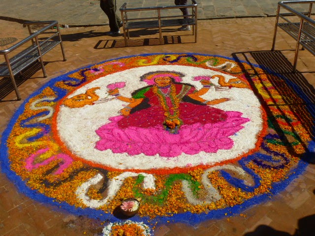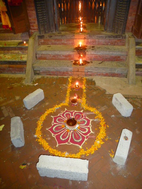 Überall, an jeder Ecke, an jedem Baum, auf jeder Schotterpiste, vor jedem Geschäft, auf allen Straßen wurden nämlich als Einladung für Lakshmi bunte Bilder gemalt und das ganze Land war überzogen von Lichtern. Stinknormale Teelichter, viele Butterlampen, Kerzen und manchmal auch Glitzergeflitzer-Lichterketten (ich sag doch, ein bisschen wie Weihnachten!).