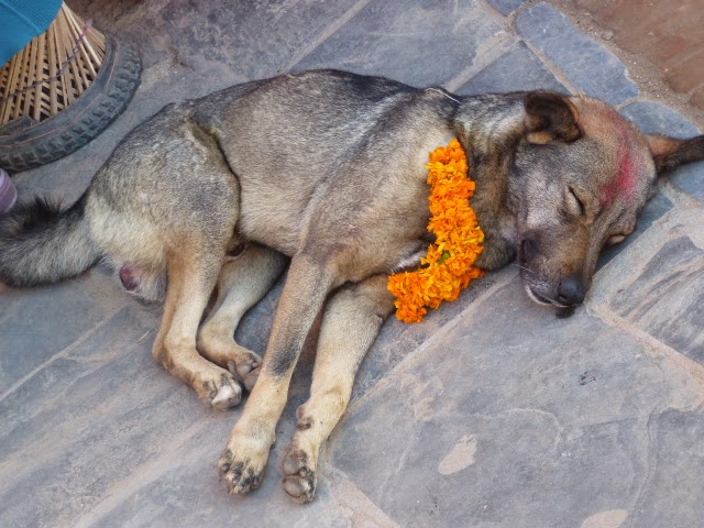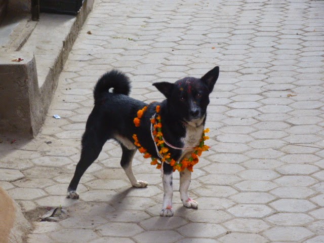 Den Hunden wurden Tikas aufgemalt, Blumengirlanden umgehängt und auch sie erhielten spezielles Essen. Hunde gelten in Nepal als Yamrajs Torwächter und müssen demnach ebenfalls bei Laune gehalten werden.
