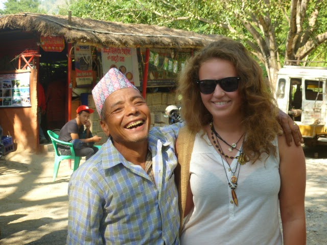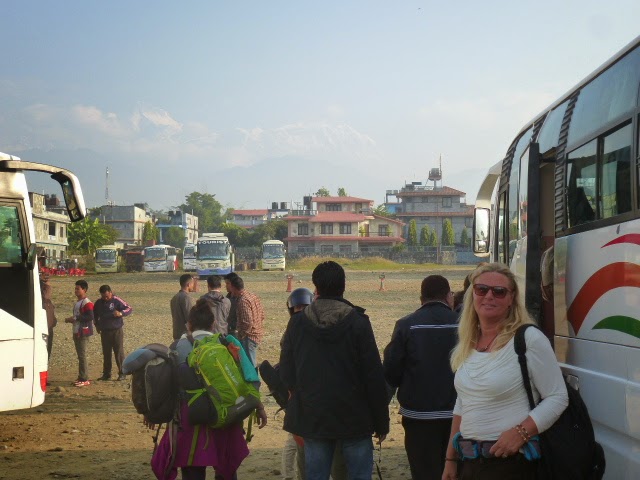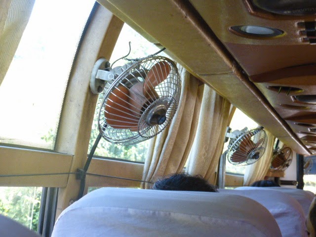 Auf den Sitzen vor uns sitzen Nepalesen. Wenn ich auf diesen Sitzen sitze, ist mein Hals noch zur Hälfte zu sehen und mein Kopf befindet sich in Ventilatorhöhe!