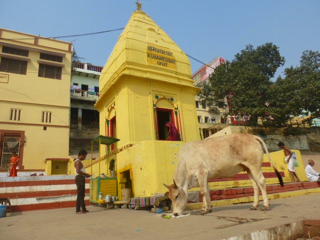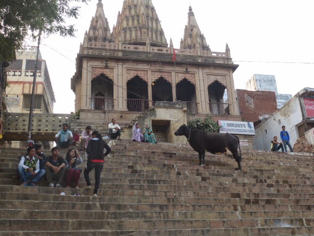Überall laufen Kühe herum! In den Straßen, in den Gassen, vor unserem Guesthouse, auf den Treppen der Ghats, vor den Tempeln.