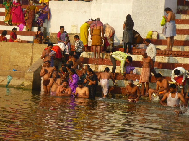 Kinder werden getauft, Alte sterben, Yogis meditieren, Musiker musizieren, Kinder lernen für die Schule oder betteln um Essen, die Leute waschen sich und ihre Wäsche, Essen wird zubereitet und verzerrt, Schauspieler üben für ihre Rollen, Touris üben Yoga und Mudras, für’s Fotoalbum werden Familienfotos geschossen, Händler versuchen, ihre Waren an den Mann zu bringen, Sadhus lesen in ihren heiligen Schriften, Bootsleute locken mit lauten „Cheap Cheap“-Rufen Touristen in ihre Boote und zwischendurch wird der Fluss auch noch als Toilette, Trinkwasserreservoir oder Abwaschbecken genutzt.