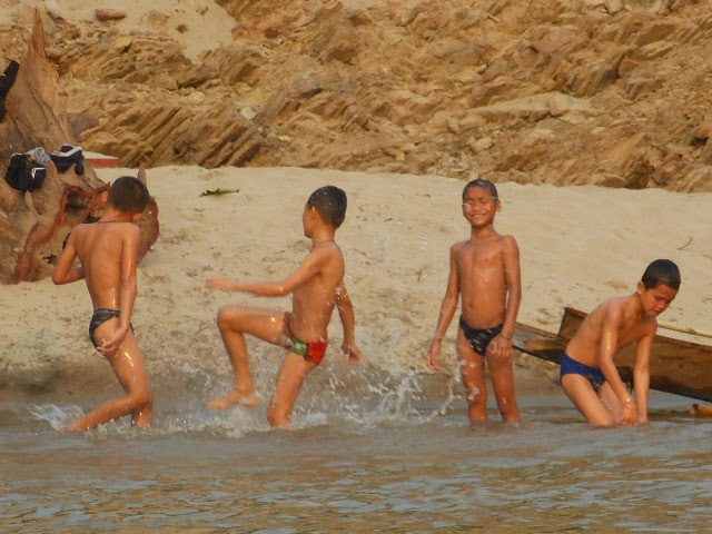 Atemberaubende Berge, kleine Dörfer, die wir hingeworfen an den Ufern des Mekongs kleben, Elefanten (!), Leute, die einem zuwinken, Jugendliche, die den Macker machen und sich mit Arschbomben vor’s Boot schmeißen und dabei schlapplachen!