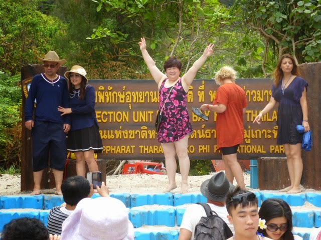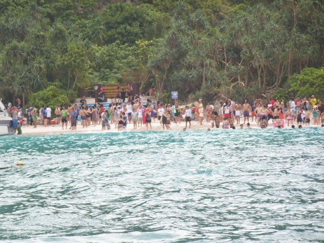 Baden konnte man nur an einer winzig kleinen abgesperrten Zone, weil das Wasser mit Speedbooten, großen Ausflugsfähren und diversen Longtailbooten vollkommen überfüllt war. Und die Boote kamen nicht etwa nur von Koh Phi Phi … nein, von überall her! Aus Phuket, von Koh Lanta, von Krabi, von Kao Lhak, von Ao Nang und von noch mehr Orten!