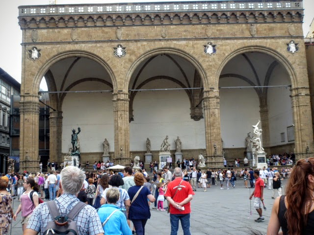 Fast ebenso überlaufen wie der Domplatz ist die Piazza della Signoria mit dem Palazzo Vecchio (dem Rathaus) und der Loggia dei Lanzi.